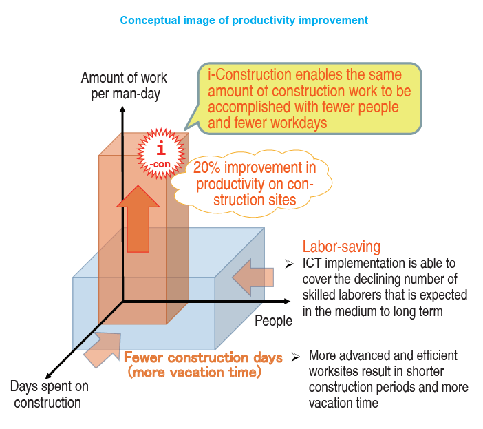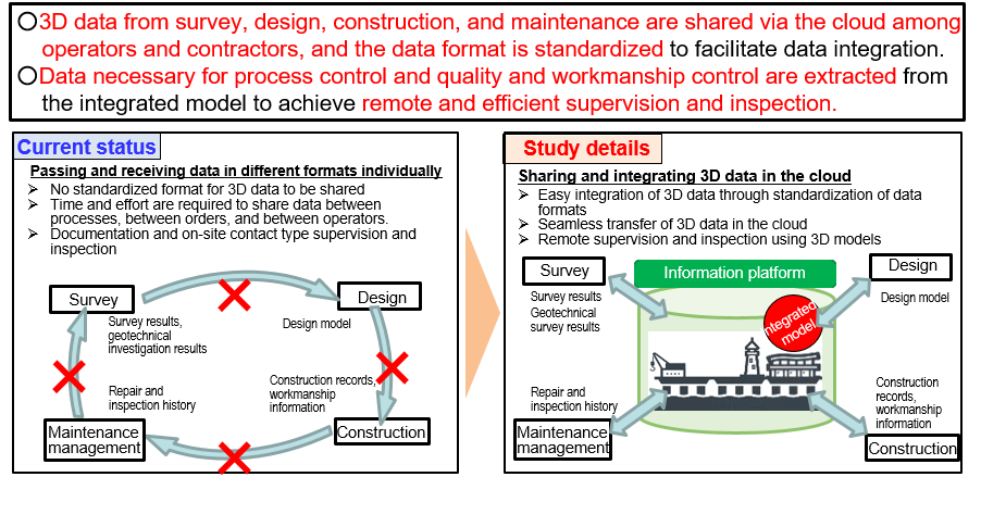With the declining birthrate, aging society, and shrinking population, there are concerns about the shortage of labor in the construction industry in Japan. Amidst these circumstances, i-Construction, the use of ICT at construction sites, has been promoted toward the aim of achieving a 20% increase in productivity by FY2025. In 2020, efforts to accelerate DX (Digital Transformation) in the infrastructure sector have begun a shift toward non-contact and remote working methods and to radically improve productivity and safety, beginning from measures against the new coronavirus infections. As for ports, efforts have been made to further utilize ICT and BIM/CIM in port construction through discussions in the "i-Construction Promotion Committee for Ports," consisting of industry participants and experts.