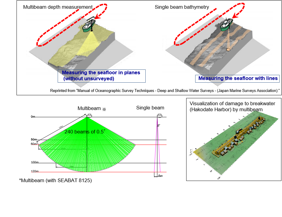 in recent years. Conventionally, single-beam sonar, which can measure only the depth directly below the surface, or a lead-weighted string, have been used to determine and gauge seafloor conditions. Multibeam sonar acquires 3D data of the seafloor through forward movement of a vessel outfitted with equipment that emits numerous acoustic beams in the left/right directions, enabling an assessment of the overall condition of the seafloor. This makes the multibeam sonar indispensable in advancing ICT construction in port construction.