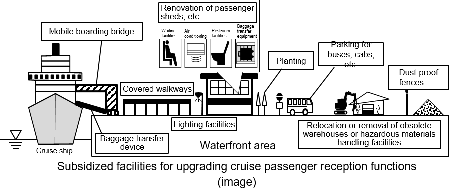 To ensure convenience and safety of cruise passengers at ports and to promote smooth receiving of cruise passengers, efforts will be made to promote the installation of mobile boarding bridges, covered walkways, etc., by local governments or private operators.