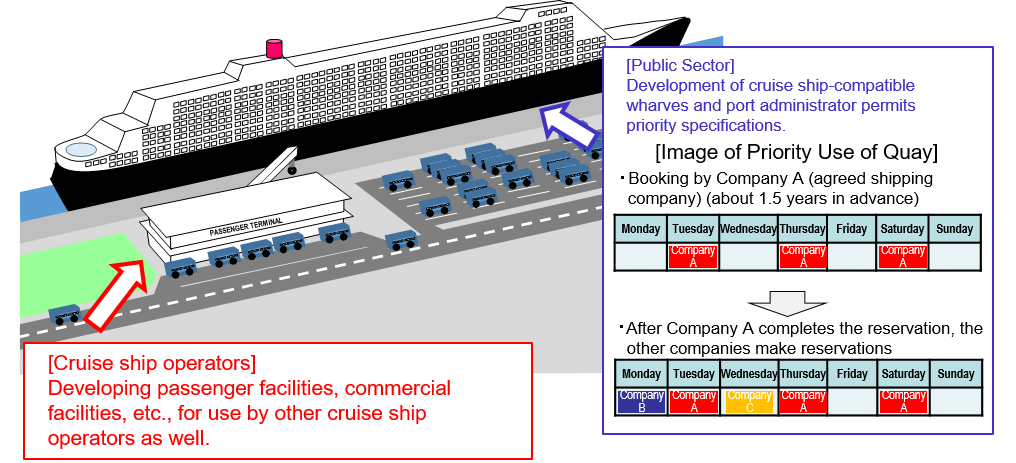 In order to respond quickly and efficiently to the demand for cruise ship calls, in accordance with the Ports and Harbors Act revised in July 2017, the public sector will develop quays exclusively for cruise ships at nine ports (Yokohama Port, Shimizu Port, Shimonoseki Port, Sasebo Port, Yatsushiro Port, Kagoshima Port, Naha Port, Motobu Port and Taira Port) designated as Hubs for International Passenger Ships. Also, cruise ship operators wishing to have priority use of the said quay will develop the passenger terminal building etc. necessary to receive cruise ships, thereby promoting the formation of an international cruise hub through cooperation between the public and private sectors.