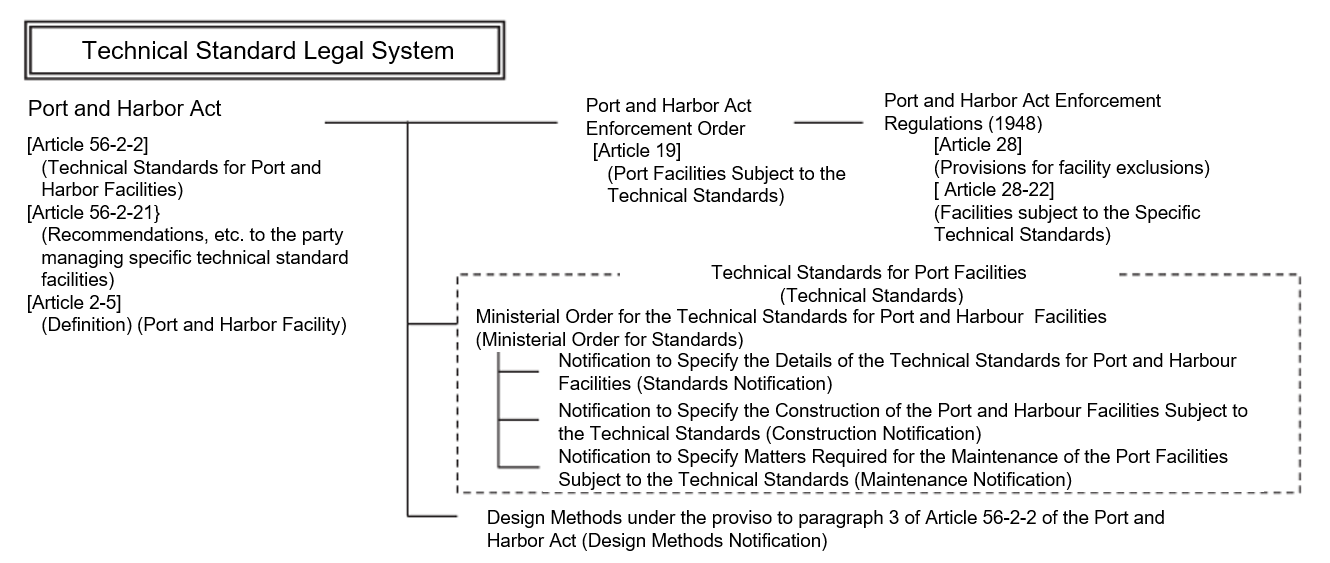 The technical standards for port and harbor facilities (hereinafter referred to as "technical standards") are provided based on Article 56-2-2 of the Port and Harbor Act, and are applied as standards for constructing, improving and maintaining port and harbor facilities.