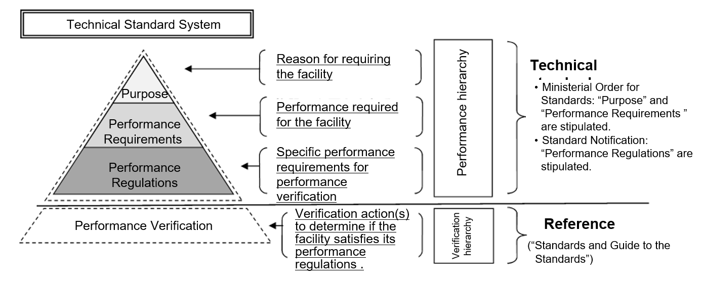The “Ministerial Order for the Technical Standards for Port and Harbour Facilities” stipulates the performance requirements of a facility for achieving its purpose (hereinafter referred to as the “performance requirements”) and the “Notification to Specify the Descriptive Details of Standards for Port and Harbour Facilities,” which provides the requirements for compliance with the relevant ministerial ordinance, stipulates the regulations that specifically describe the performance requirements (hereinafter referred to as “performance regulations”) so that performance verification can be accomplished. If it is confirmed that the performance requirements have been achieved and performance regulations satisfied, new design methods, materials, construction methods, etc. can be used. In this regard, the system is designed to flexibly respond to technological developments.