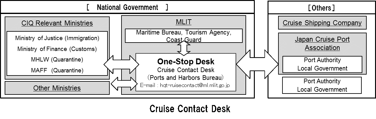 When foreign cruise ship operators have considered calling on Japanese ports, they have voiced concerns for a lack of central contact points or sufficient information on port of call destinations. For this reason, a one-stop window for foreign cruise ship operators was established in April 2016 within the Cruise Promotion Office of the Ports and Harbours Bureau of the Ministry of Land, Infrastructure, Transport and Tourism.