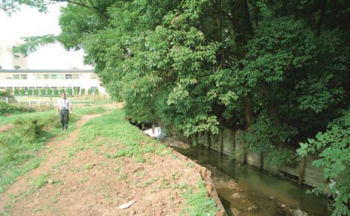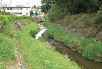When doing construction to widen a cross-section of the Umeda River, a part of the Tsurumi River system in Yokohama, Kanagawa, to prevent fl ooding,(planned capacity to increase from 6m3/s→35m3/s), the bend in the river that followed the slope of the mountain was retained, and rapids and pools were formed where fi sh can live, and waterside vegetation is encouraged to grow where the insects fi sh eat are supplied and fry can hide.。