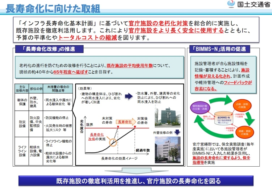このため、既存官庁施設をより長く安全に利用し、トータルコストの縮減等を実現するため、老朽化の進行を防ぐ長寿命化事業の