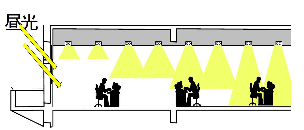 明るさセンサにより、高効率照明器具(LED照明、Hf蛍光灯)を調光制御し、適切な照度を確保しつつ消費電力を削減するものです。