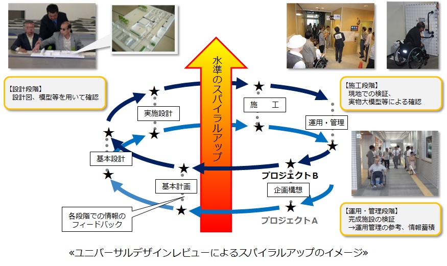 ユニバーサルデザインレビューとは、ユニバーサルデザインの視点に立ったニーズの把握、解決策の検討、評価、フィードバック(以降の施設整備への評価結果の反映)といった一連の作業を施設整備の各段階(企画・設計・施工・フォローアップ段階等)において繰り返し行うことで、常に前の段階よりも高い水準を達成しようとするスパイラルアップの取組みのことです。