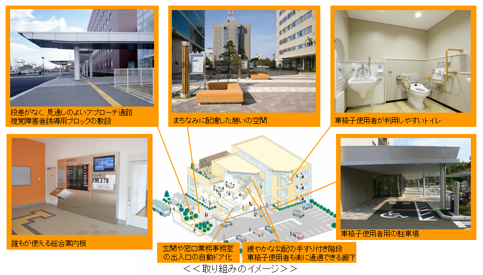 官庁営繕部では、本格的な少子・高齢社会の到来を背景として、ユニバーサルデザインの実現を目指し、高齢者・障害者等を含むすべての人が、安全に、安心して、円滑かつ快適に利用できる官庁施設を目指し、施設整備等を進めていくこととしています。 平成18年には「官庁施設のユニバーサルデザインに関する基準」を制定し、法令において求められる内容を満たすのみではなく、地域住民を含めた施設利用者等から意見聴取を行うユニバーサルデザインレビューの実施、地方公共団体等との連携による周辺地域との一体的なバリアフリー化の実施などにより、すべての人が、安全に、安心して、円滑かつ快適に利用できることを目指した整備を推進しています。
