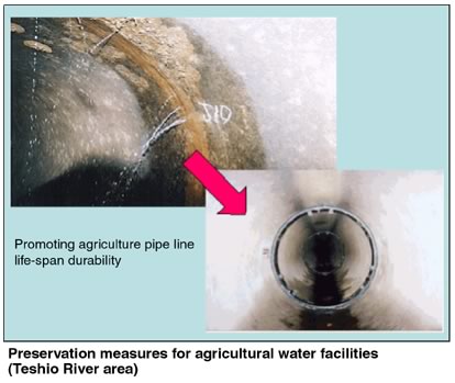 | Disaster prevention measures For the recovery farmland and agriculture facility functions and also for proactive prevention of disaster the plan implements the construction of disaster prevention dams, repair of reservoirs and river structures for agriculture, measures to prevent landslides and other disasters caused by the nature of the soil, etc. | |