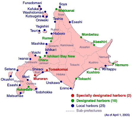 There are 37 harbors in Hokkaido. Dividing harbors according to rank, there are two specially designated harbors, 10 designated harbors and 25 local harbors. The total handling cargo volume of these harbors was 227 million tons in 2003.
