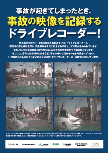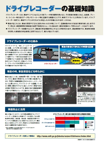 事故やニアミスなどにより急ブレーキ等の衝撃を関知した際に前後数十秒間を画像として保存することが可能であるドライブレコーダーを搭載することで、運転者の安全運転意識の向上を促し、交通事故を未然に防止する手段としての活用が期待でき、また、実際の映像を用いて、安全運転への教育や事故時の証拠等に活用できます。このような、導入メリットを運転者に周知するため、リーフレットを作成しました。