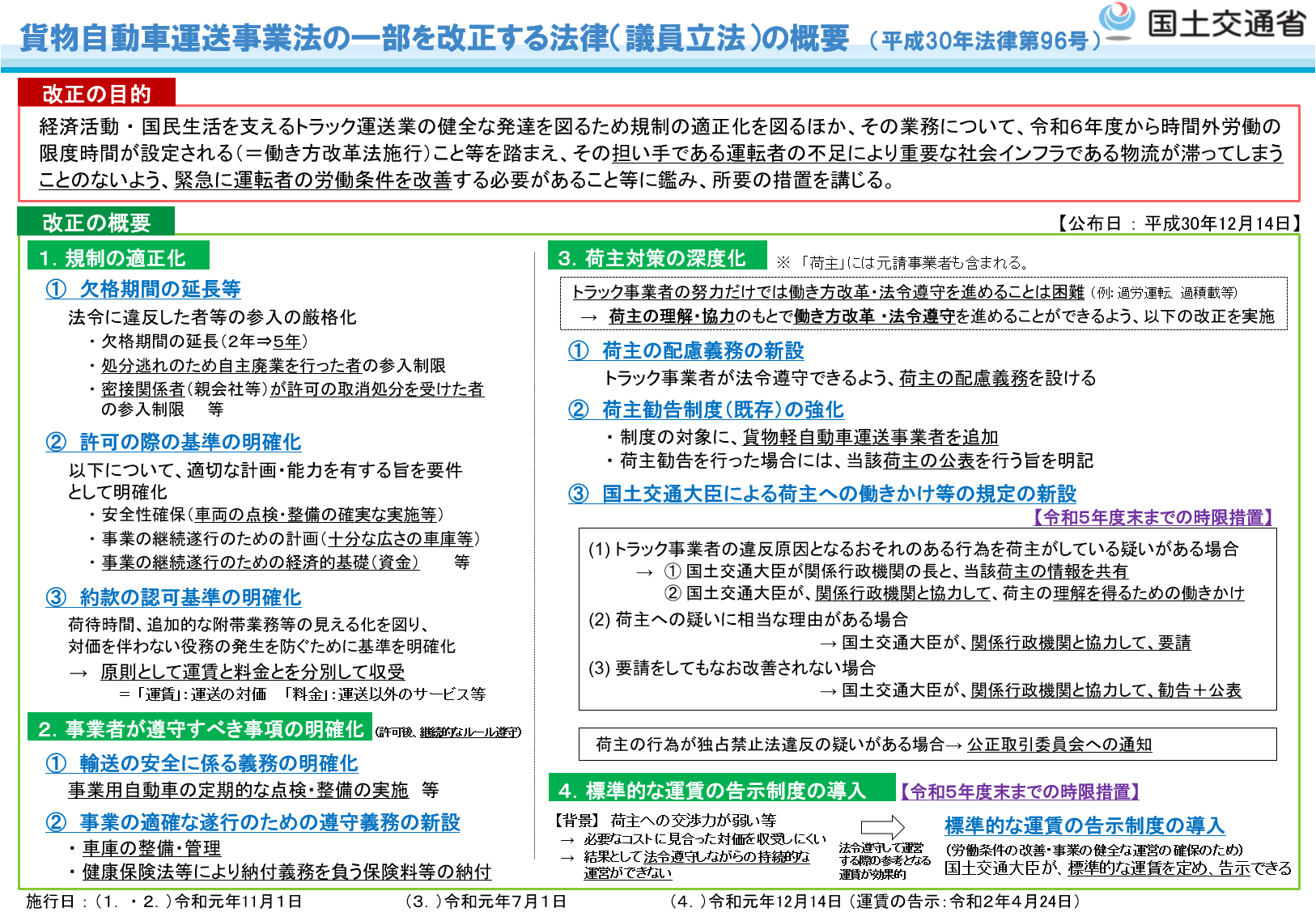 トラックドライバー不足により物流が滞ることのないよう、ドライバーの労働条件の改善等を図り、トラック運送業において働き方改革を進める観点から、第197回国会(臨時国会)において、議員立法により貨物自動車運送事業法の改正が行われました。