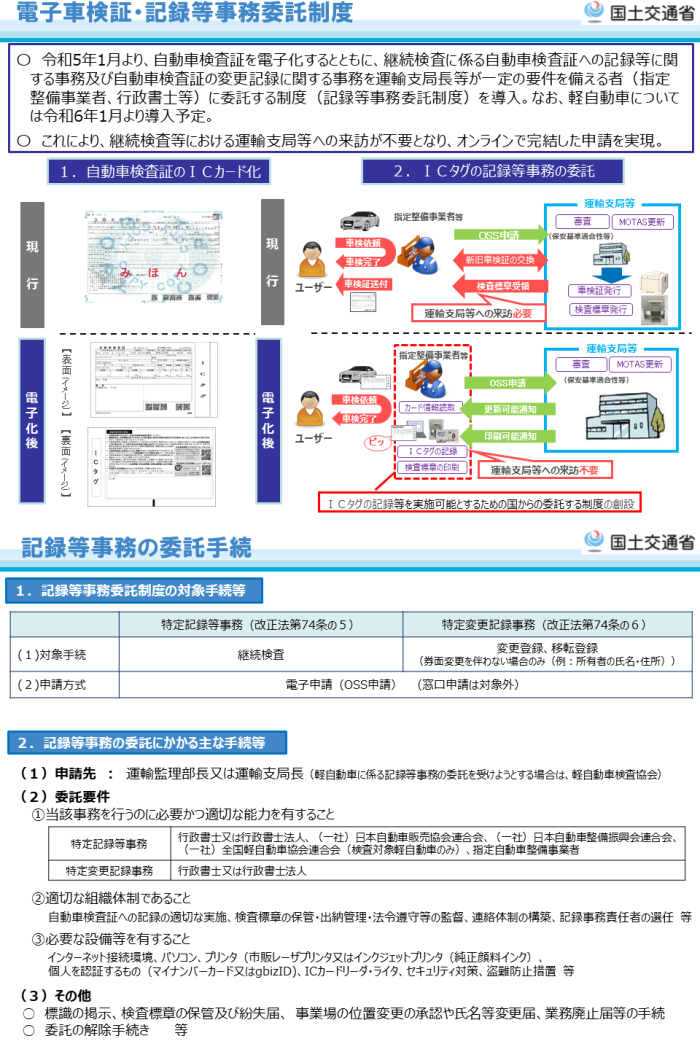 下記、『委託要領』や『委託要領の運用』等をよくご確認頂いたうえで、 「記録事務代行ポータル」から申請してください。 特定記録等事務及び特定変更記録事務の業務を行うには、令和5年1月以降に交付※される電子車検証が必要となります。 ※令和5年1月以降運輸支局等において、新規検査、継続検査、構造等変更検査及び登録手続き等、従来「自動車検査証」が交付される手続きを行った場合に電子車検証が交付されます。 |