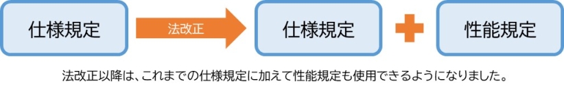 2000年の改正施行で性能規定化が行われ、各種(防火・構造・設備・一般構造等)の構造方法について、