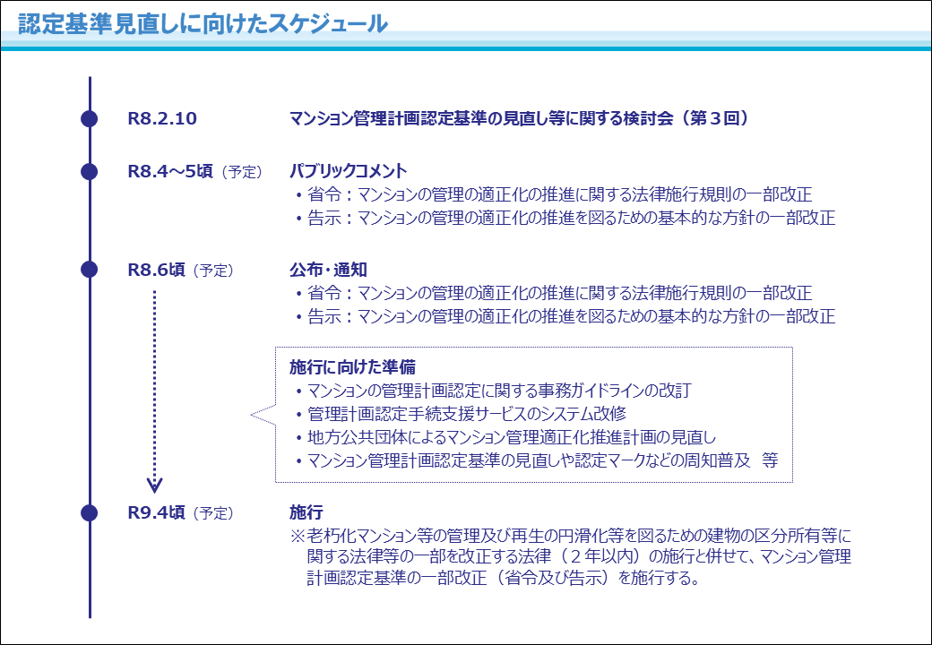 マンションの管理の適正化の推進に関する法律の一部改正(令和7年5月30日公布)や「標準管理規約の見直し及び管理計画認定制度のあり方に関するワーキンググループとりまとめ(令和6年6月)」に基づき、マンション管理計画認定基準の見直し等について、マンションに関する学識経験者や業界団体等の知見を踏まえて検討を行います。