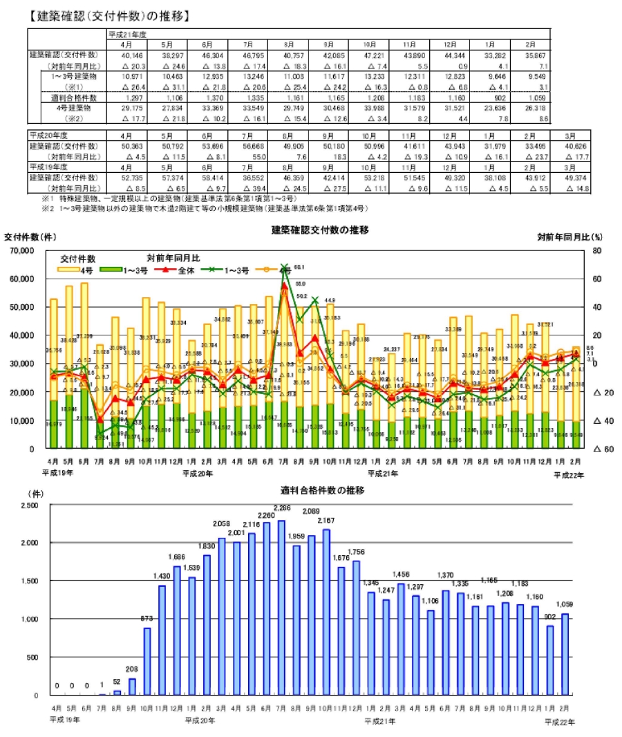・2月の建築確認件数は、前月より増加し、対前年同月比は増加。対前年同月比は1~3号建築物、4号建築物ともに増加。構造計算適合性判定の合格件数は前月より増加。