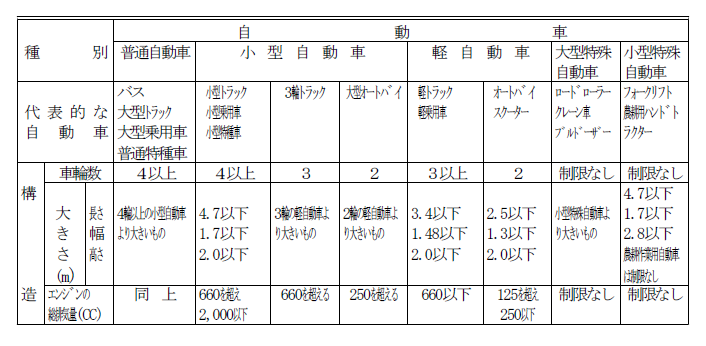道路運送車両法施行規則第2条に定める種別は、普通自動車、小型自動車、大型特殊自動車、小型特殊自動車及び軽自動車をいい、下表のとおり分類されます。