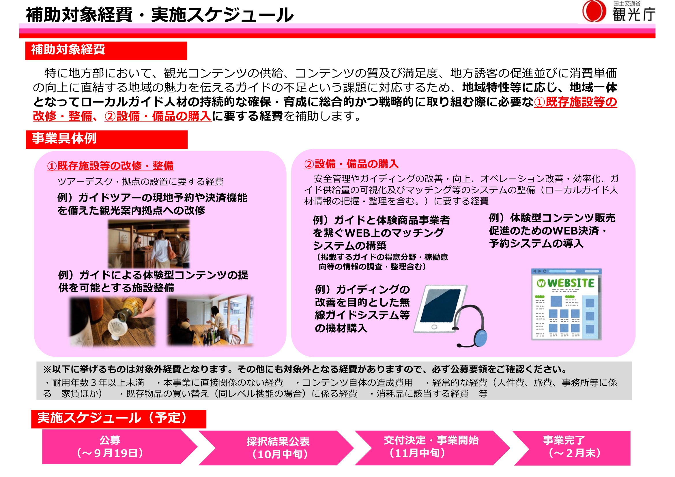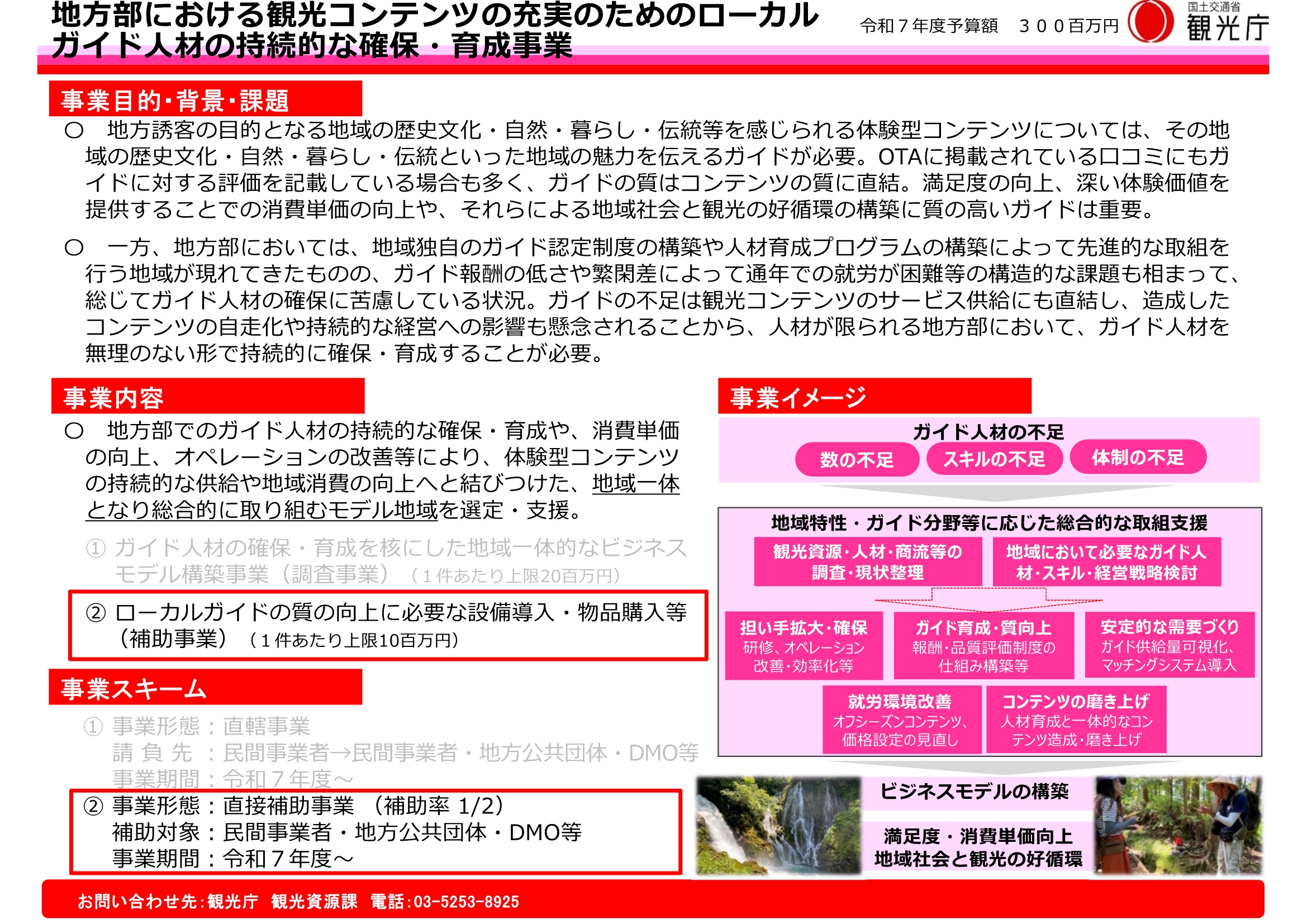 観光庁では、特に人材が限られる地方部において、観光コンテンツの持続的な供給や地域消費の向上へ結びつけるために、「人材確保」「人材育成」の入口戦略と「市場活性化」の出口戦略の双方を見据え、地域特性等に応じ、地域一体となってローカルガイド人材の持続的な確保・育成に総合的かつ戦略的に取り組む際に必要な既存施設等の改修・整備、設備・備品の購入等に対する補助を行います。