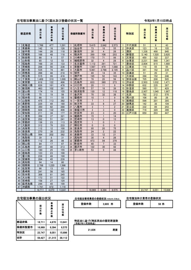 住宅宿泊事業法に基づく届出及び登録の状況(令和8年1月15日時点)