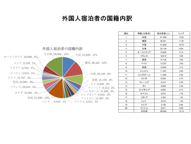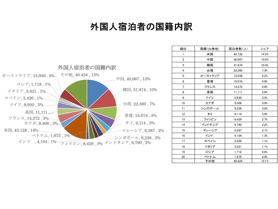 - 外国人宿泊者を国籍別でみると、第1位が米国、第2位が韓国、第3位が中国、第4位が台湾、第5位がオーストラリアであった。上位5カ国・地域で外国人宿泊者数の49.3%を占める。