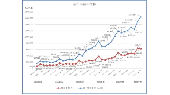 - 日本国籍を有する者が238,882人(37.9%)、外国人が390,789人(62.1%)であった。前年10-11月分と比較して、日本国籍を有する者の数(前年同期比124.7%)、外国人宿泊者数(前年同期比168.2%)となった。