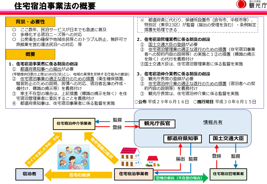 住宅宿泊事業の届出制度や住宅宿泊管理業・住宅宿泊仲介業の登録制度など一定のルールを定め、健全な民泊サービスの普及を図ります。住宅宿泊事業法の関係法令や住宅宿泊事業等を中心とした住宅宿泊事業法に基づく民泊制度の詳細な情報については『民泊制度ポータルサイト』をご覧ください。