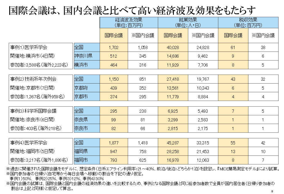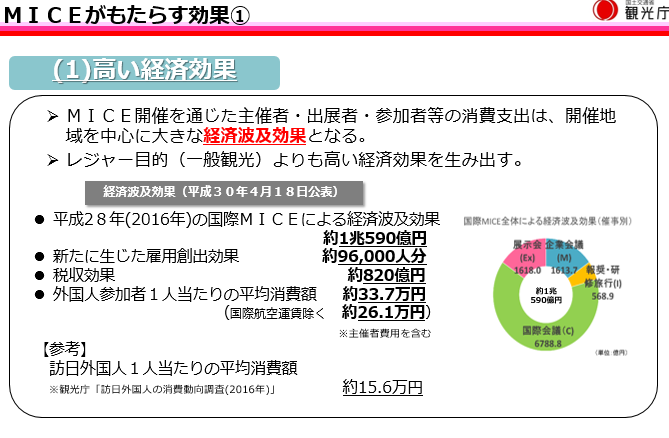 観光庁は、2017年度(平成29年度)に国際MICE全体の調査を実施し、日本国内で開催された国際MICE全体による経済波及効果(2016年(平成28年)開催分)を初めて算出しました。