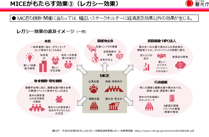 MICE開催を通じて世界から企業や学会の主要メンバーが我が国に集うことは、我が国の関係者と海外の関係者のネットワークを構築し、新しいビジネスやイノベーションの機会を呼び込むことにつながります。