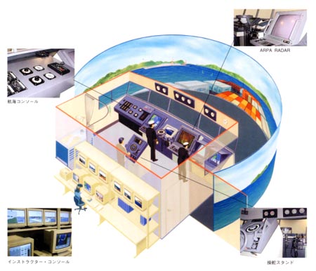 | (4) | ビジュアル操船シミュレータ実験 他船交通流の中での操船性、並びに減速操船時の操船性について、実際に操船者が操船することにより、ヒューマンファクターを加味して操船性を検証することを目的として、ビジュアル操船シミュレータによる実験を行った。