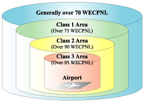 In addition, concerning areas that are still impacted in spite of these measures, the following measures are being implemented on the basis of the Aircraft Noise Prevention Law : 1) assistance towards the soundproof construction of houses, schools and hospitals, 2) compensation for relocation, and 3) construction of green tract zones etc..