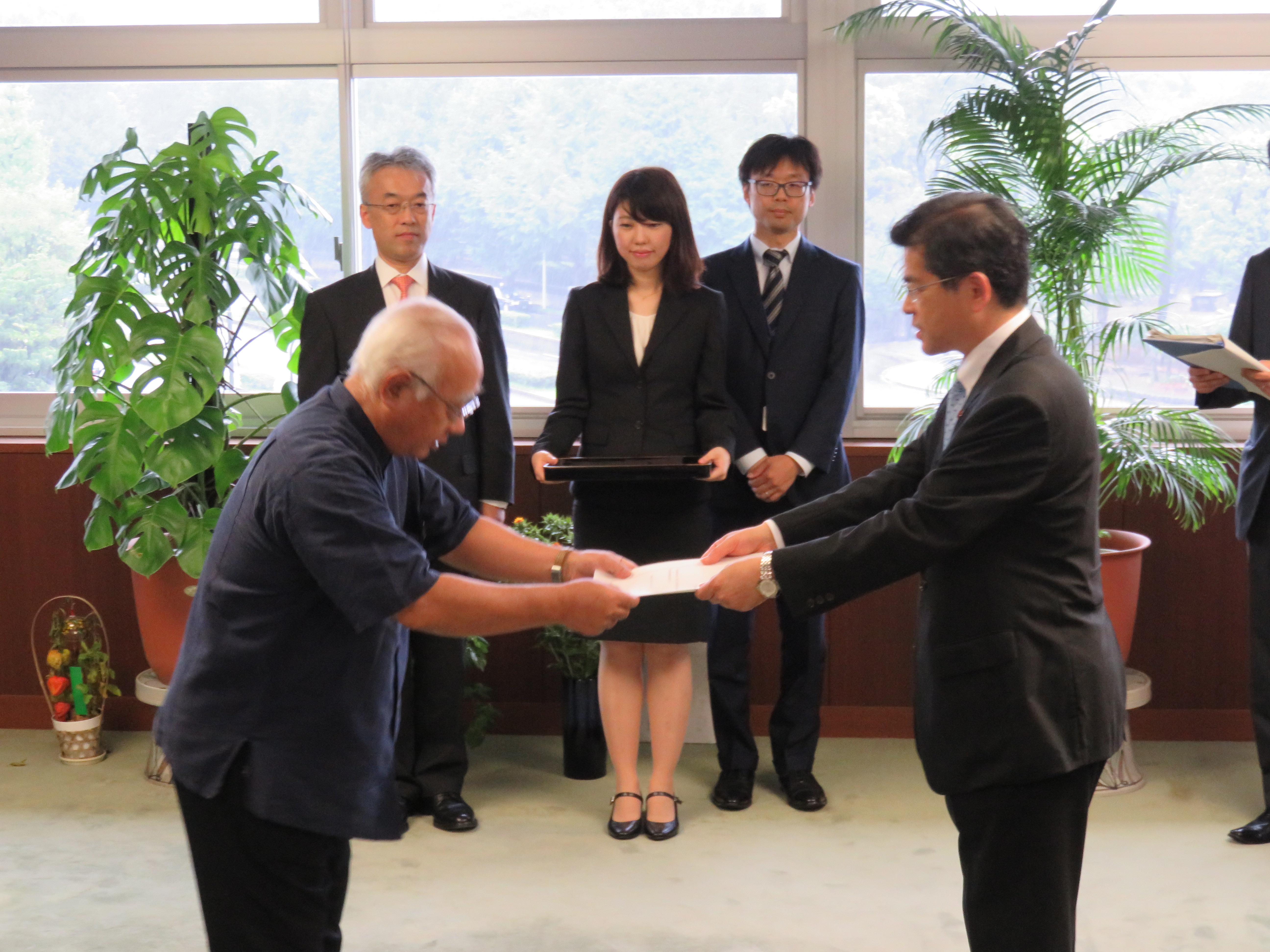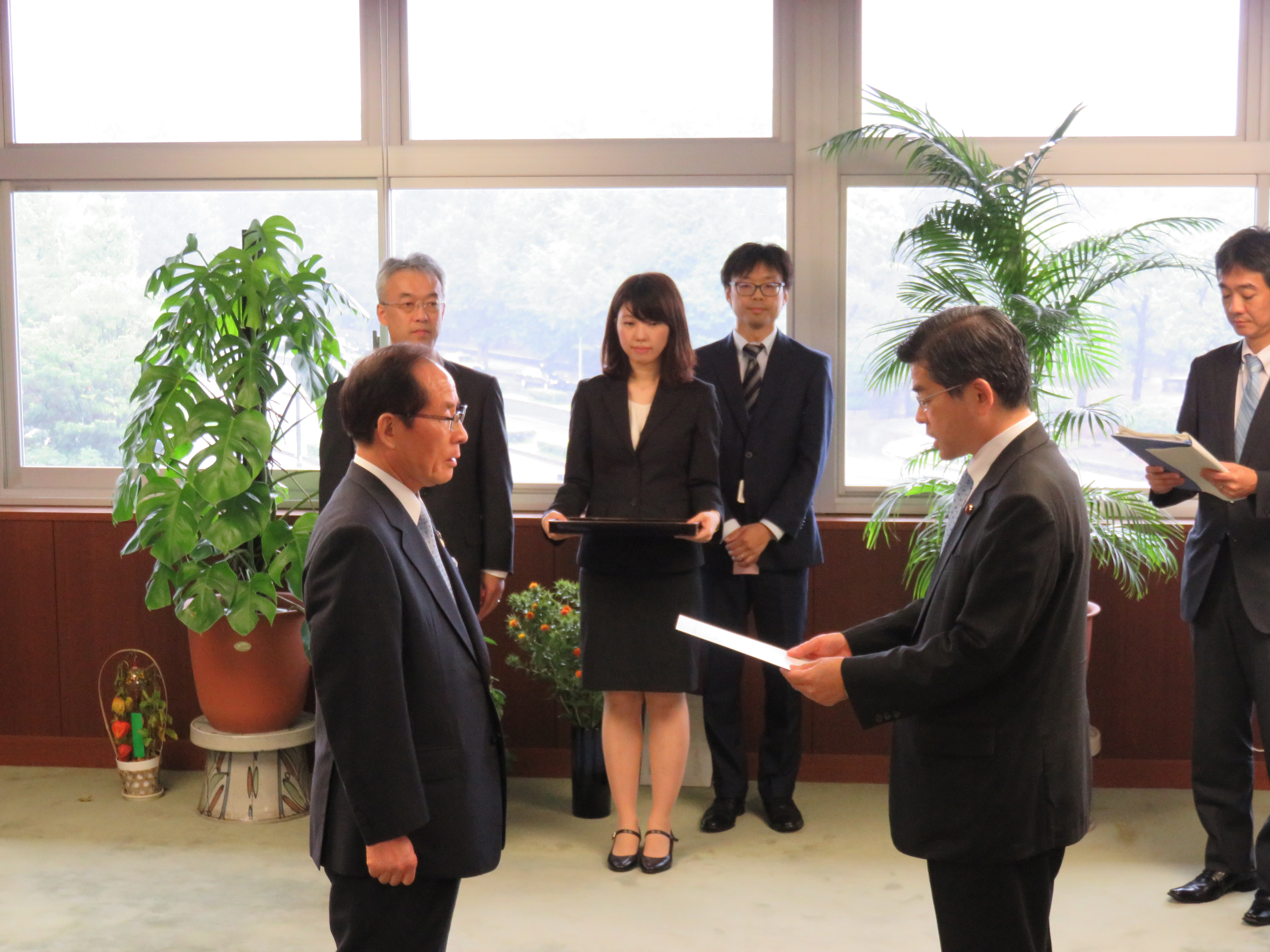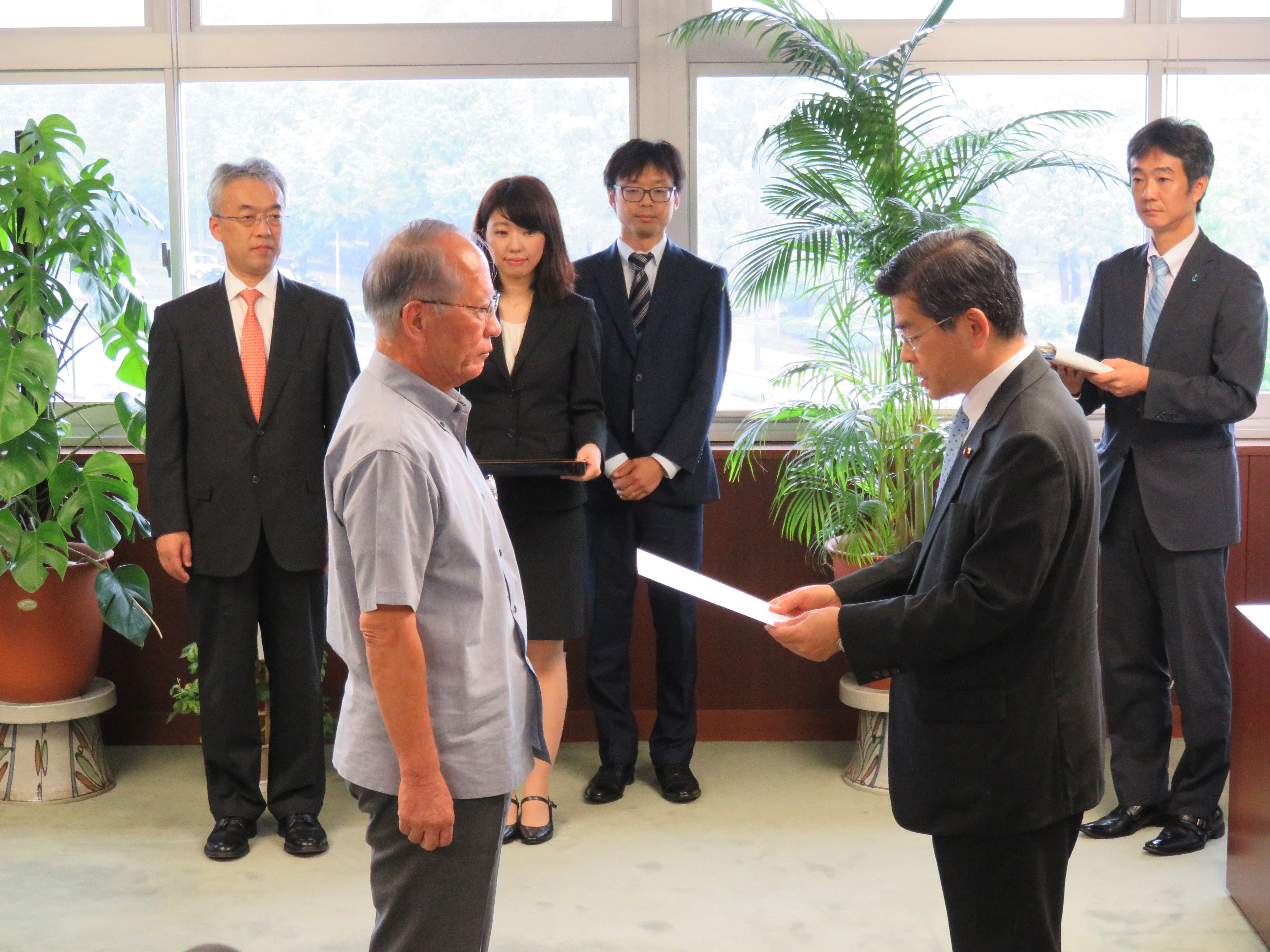 石井大臣から浦崎沖縄県副知事に指定書を交付