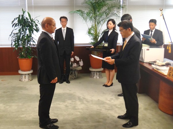 石井大臣から田原那覇港管理組合常勤副管理者に指定書を交付