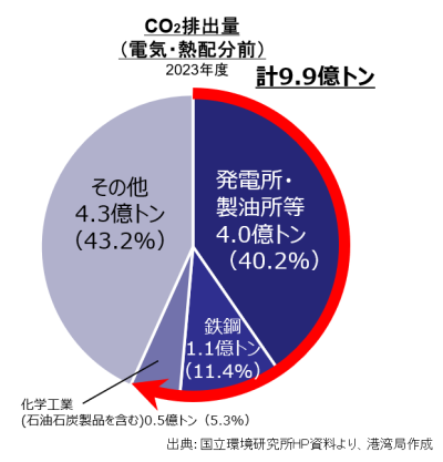 港湾においては、サプライチェーン全体の脱炭素化に取り組む荷主等のニーズに対応し、港湾施設の脱炭素化等の取組を進めることで、荷主や船社から選ばれる競争力のある港湾を形成することが必要となっています。また、港湾・臨海部には温室効果ガスを多く排出する産業が集積しており、港湾において、産業のエネルギー転換に必要となる水素・アンモニア等の供給に必要な環境整備を行うことで、産業構造の転換や競争力の強化に貢献することが重要です。