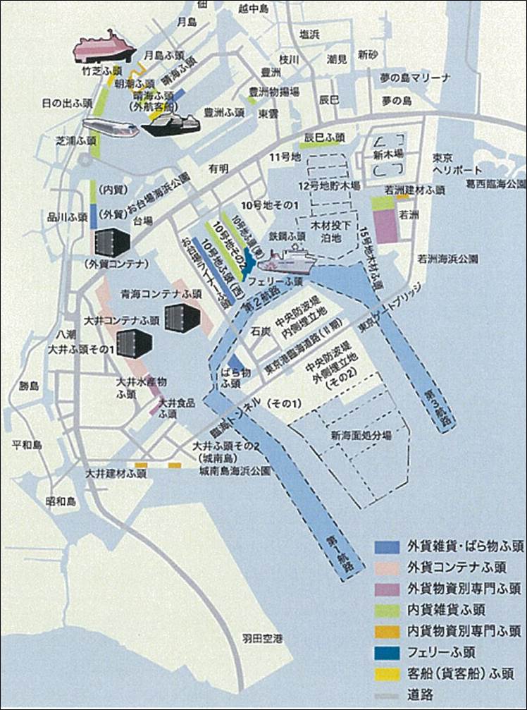 東京港の全景 東京港の取り扱い貨物量 東京港の埠頭の分布図