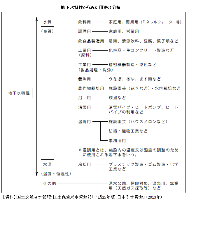 現在、地下水は生活用水(飲料用、調理用、浴用等)、工業用水(飲食品製造業、原料用、洗浄用、冷却用等)、農業用水(農作物栽培用、温調等用)、養魚用水等、各種の用途に利用されています。また、この他にも都市蓄熱(ヒートポンプ、ヒートパイプ等)や、 湧水公園等の環境用水といった多様な用途に利用されています。