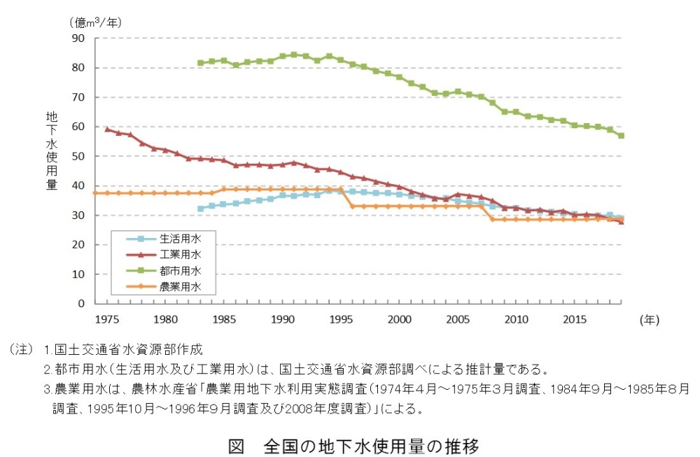 全国の地下水使用量の近年の推移をみると、生活用水はほぼ横ばいとなっている一方、工業用水が減少傾向にあり、両者を合わせた都市用水全体としても減少傾向となっています。