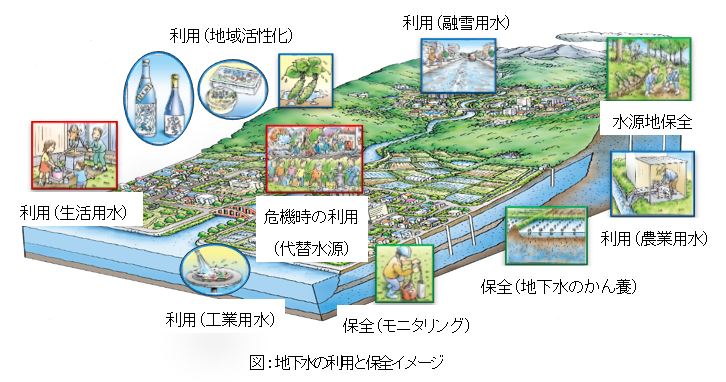 水循環基本計画では、地盤沈下、塩水化、地下水汚染などの地下水障害の防止や生態系の保全等を確保しつつ、地域の地下水を守り、水資源等として利用する「持続可能な地下水の保全と利用」を推進するため、地域の実情に応じた地下水マネジメントに取り組むこととされています。