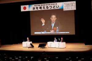 表彰式の後は、気象キャスターの井田寛子さんより「近年の異常気象と気候変動~水の脅威と恵み~」と題しまして、ご講演いただきました。その後、小池俊雄水の週間実行委員会会長がコーディネーターを務め、前段でご講演いただいた井田寛子さんと政策研究大学院大学教授の知花武佳さんとのパネルディスカッション「治水・利水・環境の調和を目指して」が行われました。