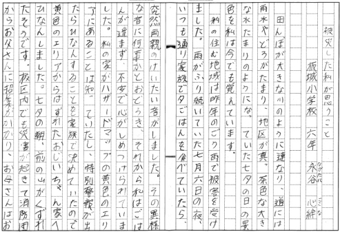 | 広島県 東広島市立板城小学校 6年 永谷 心絆 「被災した私が思うこと」 |