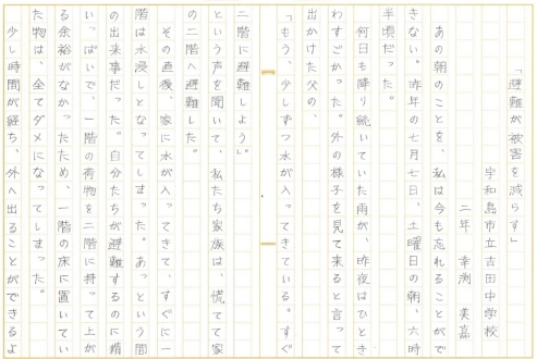 | 愛媛県 宇和島市立吉田中学校 2年 幸渕 美嘉 「避難が被害を減らす」 |