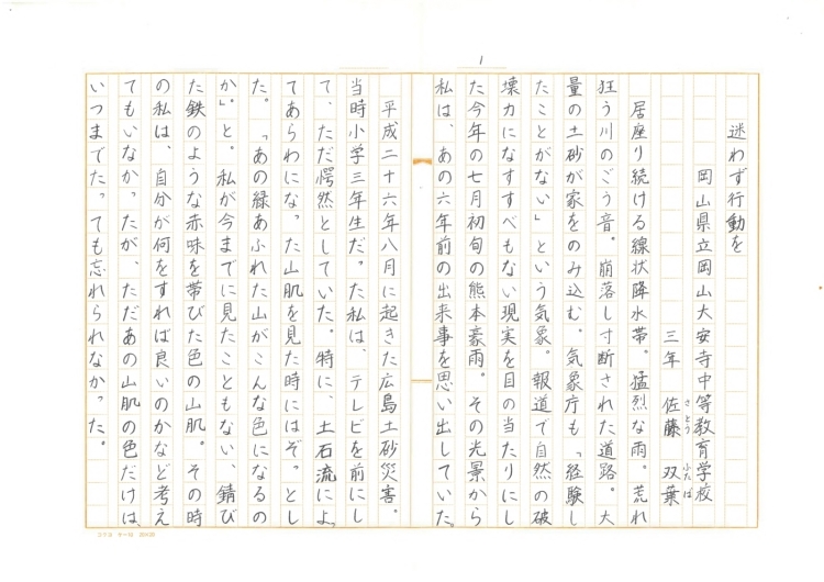 | 岡山県 岡山県立岡山大安寺中等教育学校 3年 佐藤 双葉 「迷わず行動を」 |