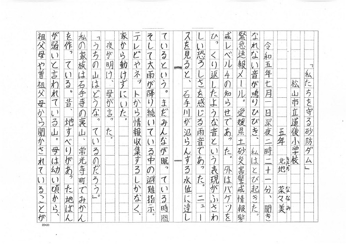 | 愛媛県 松山市立道後小学校 5年 北地 菜々美 「私たちを守る砂防ダム」 |