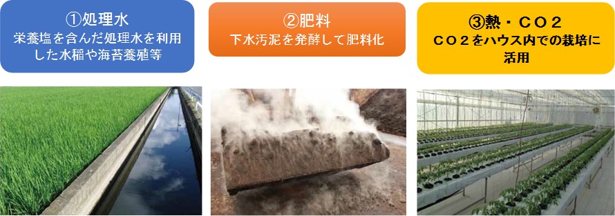 下水処理場には水、窒素・リンを含む下水汚泥の他、下水汚泥処理時等に発生するCO₂、熱エネルギーなども豊富に存在します。これらの資源を有効に活用し、循環型システムを構築することが重要であり、再生水の農業用水利用や、下水汚泥のコンポスト化等、下水道資源の活用により農業等に貢献している好事例が各地域で存在します。