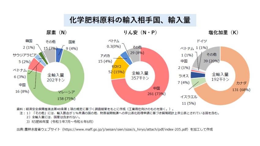 我が国においては、主な化学肥料の原料である尿素、りん安(りん酸アンモニウム)、塩化加里(塩化カリウム)は、ほぼ輸入に依存しており、世界的に資源が偏在しているため、輸入相手も偏在しています。特に、りん安については、7割以上を中国からの輸入が占めていました(財務省「貿易統計」(令和3年7月~令和4年6月))。