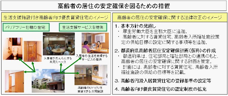 我が国は本格的な高齢化社会へと向かっており、高齢者が安心し自立して暮らせるバリアフリー化された住宅ストックの整備を一層促進する必要がある。また、「社会保障の機能強化のための緊急対策~5つの安心プラン~」等を踏まえ、生活支援サービスを提供するケア付き住宅等の供給を促進するため、次の特例措置を講じる。