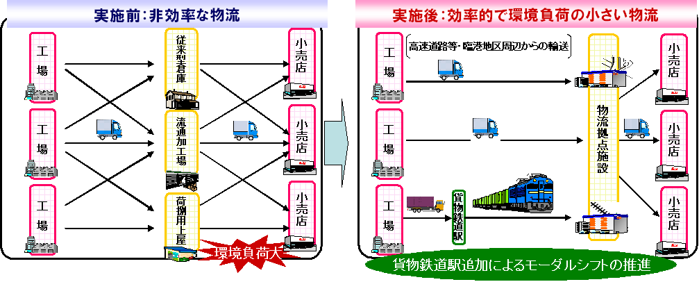 また、環境負荷のさらなる低減に資する物流効率化を図るため、現行の立地要件である高速道路等IC5㎞以内・臨港地区に鉄道貨物駅5km以内を追加する。