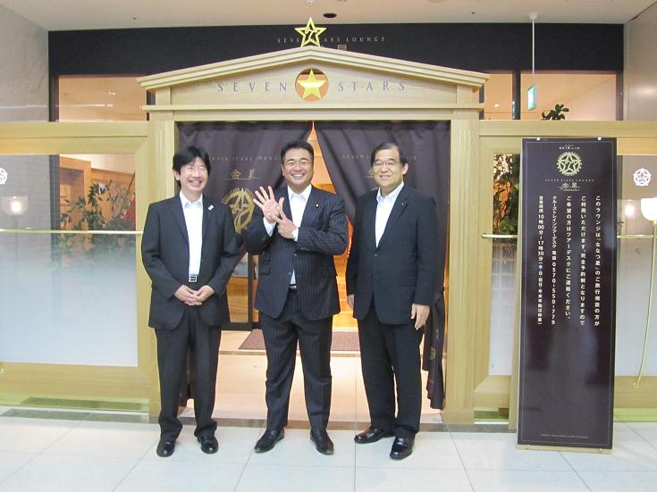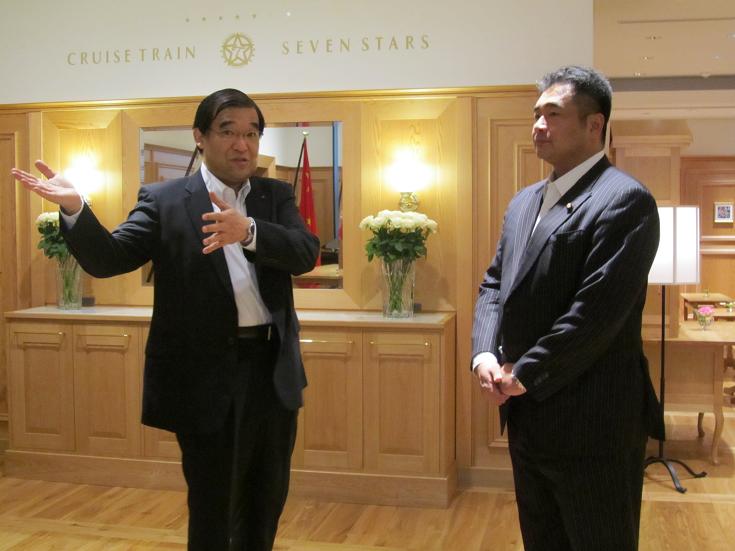 博多駅では、10月15日運行開始予定のクルーズトレイン「ななつ星in九州」の専用ラウンジを視察し、列車の運行計画・販売計画について説明を受けるとともに、鉄道事業の現状や課題等について意見交換を行いました。