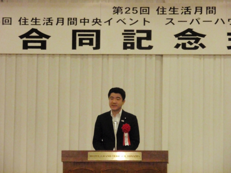 10月19日(土)、富山市において、第25回住生活月間及び第25回住生活月間中央イベント・スーパーハウジングフェアin富山の合同記念式典が開催され、住生活月間功労者表彰などが行われました。 野上国土交通副大臣から、これまで住宅・建築の各分野でご活躍された方々へのお祝いとともに、豊かな住生活の実現に向けて取り組んでいく、旨の挨拶がありました。