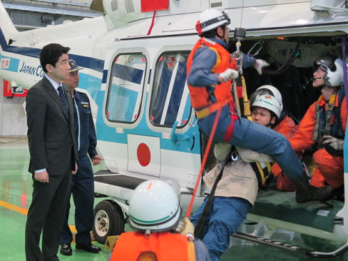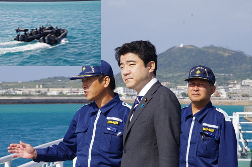 石垣航空基地では施設や同基地所属ヘリコプターでの展示訓練等を視察し、また、石垣海上保安部では巡視船みずきに乗船して、石垣航空基地所属ヘリコプターから同船へ潜水士が降下し、要救助者を吊り上げる訓練や巡視船はてるま船上からゴムボートでの規制訓練等を視察しました。