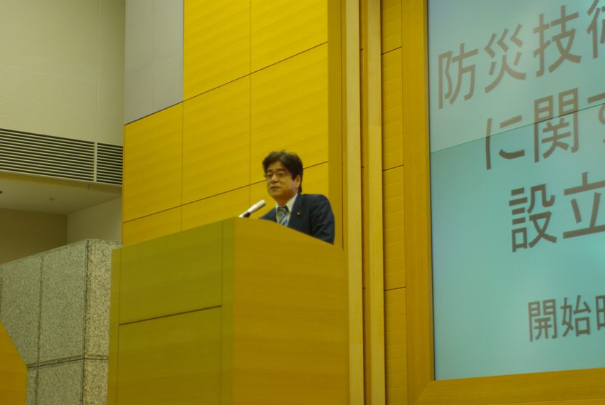 土井亨国土交通大臣政務官が冒頭に挨拶し、防災技術の海外展開に向けた国土交通省の取組みや、産学官が連携した新組織「日本防災プラットフォーム」への期待について発言しました。